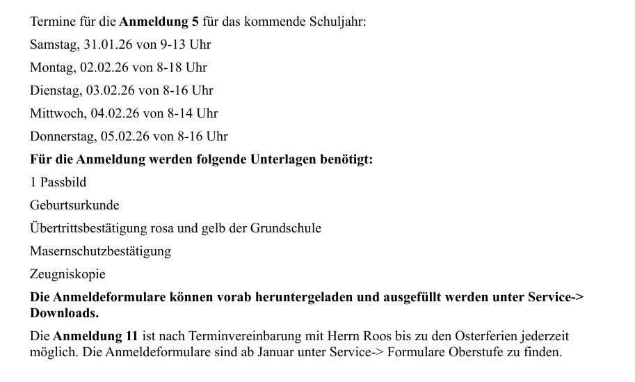 Termine für die Anmeldung 5 für das kommende Schuljahr: Samstag, 31.01.26 von 9-13 Uhr Montag, 02.02.26 von 8-18 Uhr Dienstag, 03.02.26 von 8-16 Uhr Mittwoch, 04.02.26 von 8-14 Uhr Donnerstag, 05.02.26 von 8-16 Uhr Für die Anmeldung werden folgende Unterlagen...