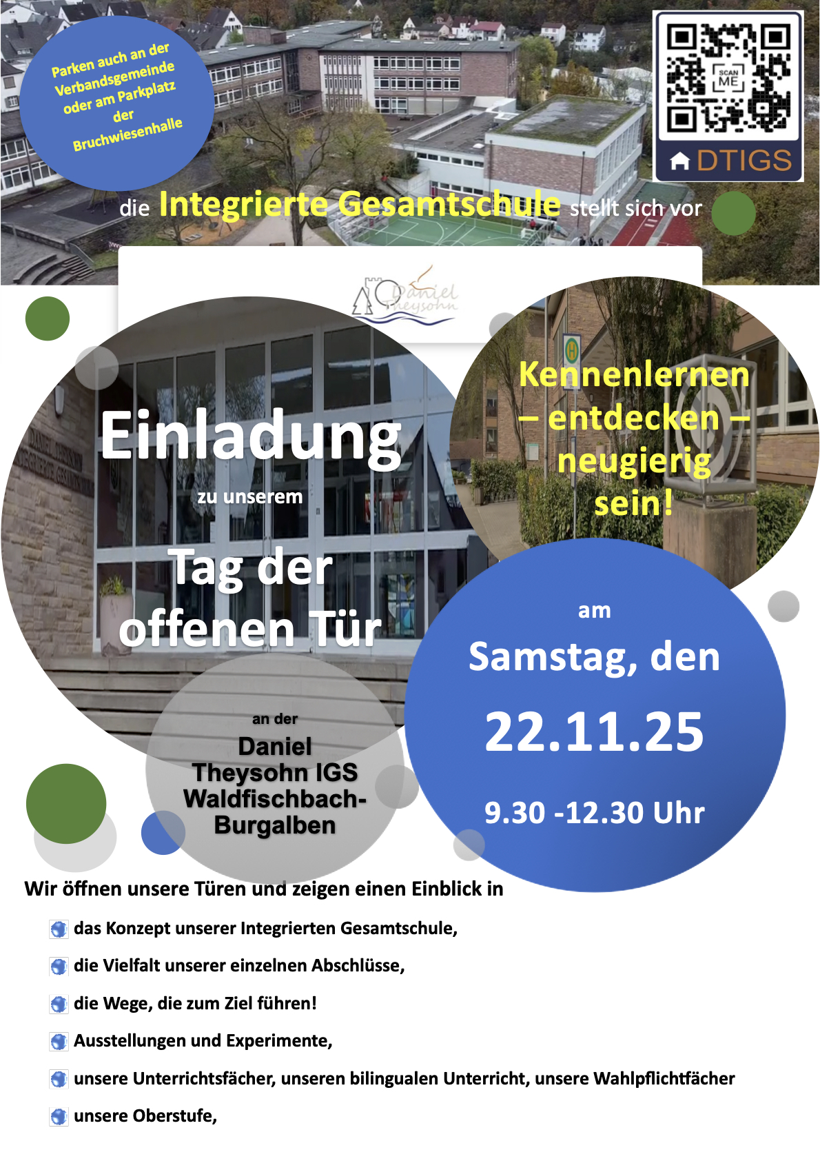 Liebe Schülerinnen und Schüler der Grundschulen, liebe Eltern und Interessierte,wir laden herzlich zu unserem Tag der offenen Tür am Samstag, dem 22. November 2025 von 9:30 Uhr bis 12:30 Uhr an der Daniel Theysohn Integrierte Gesamtschule in...