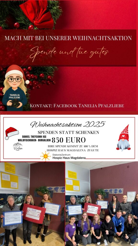 Am Samstag, den 22. November, durfte ich im Rahmen der Weihnachtsaktion „Spenden statt Schenken“ am Tag der offenen Tür von der Schülervertretung der Daniel Theysohn IGS Waldfischbach – Burgalben einen Spendenscheck in Höhe von 850 € für das Hospiz Haus Magdalena entgegennehmen.